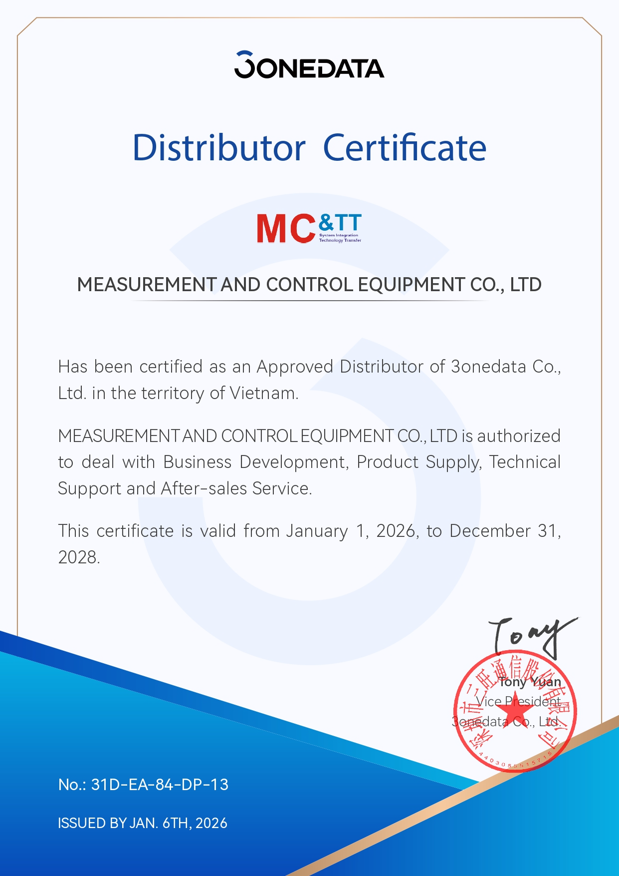 Công ty TNHH Thiết bị Đo lường và Điều khiển (MC&TT Co., Ltd) là đại diện phân phối chính thức hãng 3Onedata tại thị trường Việt Nam, cung cấp sản phẩm và giải pháp truyền thông công nghiệp chất lượng cao.