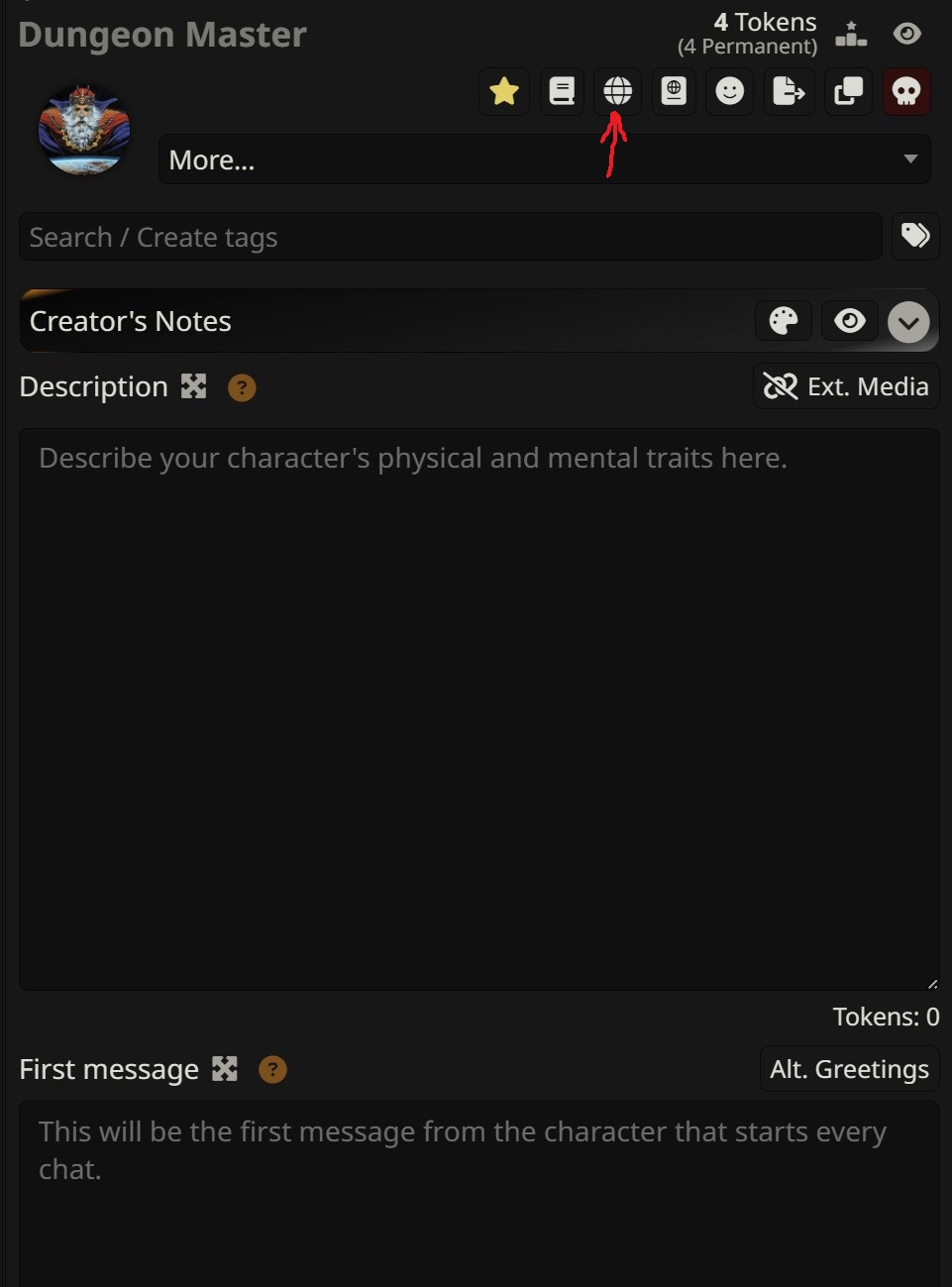 <characters></characters>наравне со всеми другими персонажами. Однако, вам ничего не мешает использовать стандартный функционал для описания персон в таверне и не переносить эту информацию в лорбук