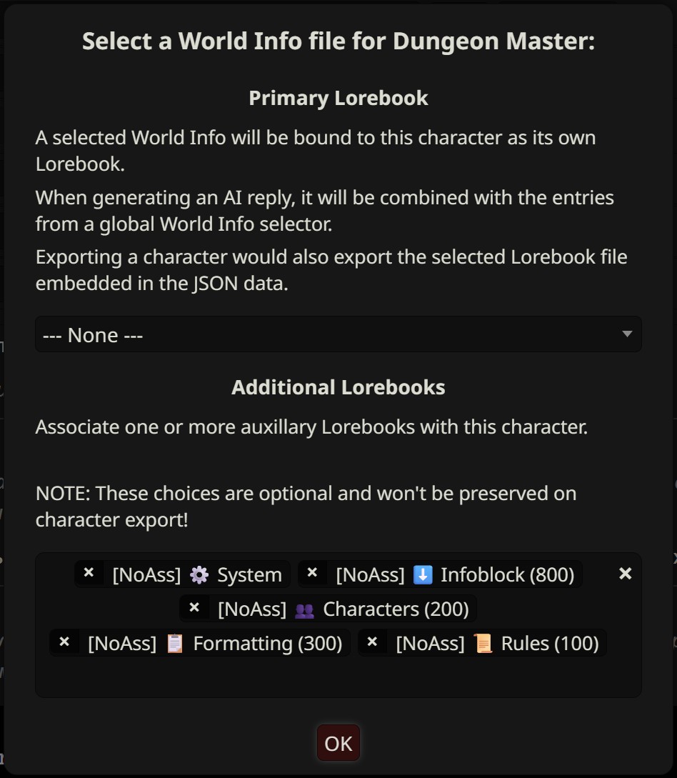 Из всех лорбуков только system, characters и formatting являются обязательным. rules и infoblock отражают мои личные предпочтения и не являются необходимыми для работы всей системы. Смотри LLMCrutches_SystemLorebook для понимания мотивации использовать лорбуки в качестве инструкций для text completion.