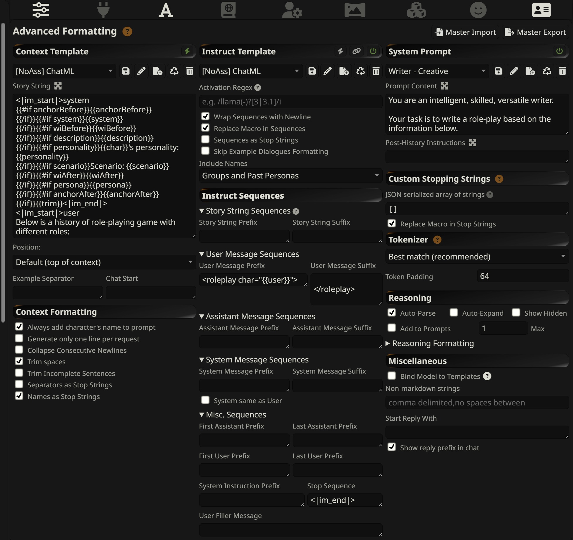 2. Импортируйте formatting.json в секции Advanced Formatting (кнопка "Master Import" вверху справа). Данный файл предоставляет шаблоны для Context Template и Instruct Template в формате ChatML. Если вам нужен другой формат модели, то вы можете сделать шаблон под нужный вам формат, используя предоставленный шаблон в качестве примера.