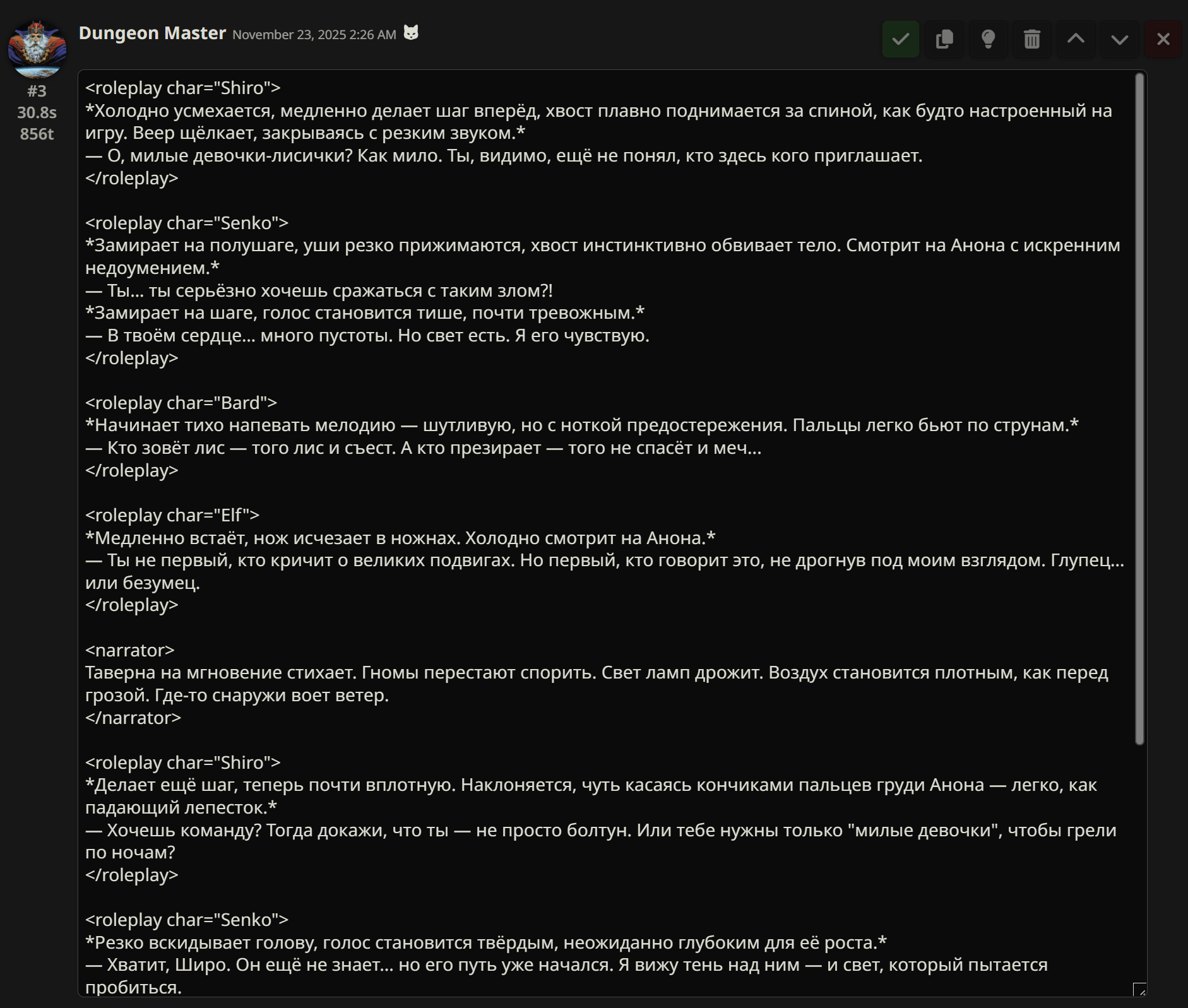 7. PROFIT! Если вы всё настрили правильно, то при ролеплее с нарратором он будет отвечать от лица персонажей, описанных в секции Characters и обрамлять все ответы в <roleplay> блоки. А regex'ы позволят нам отформатировать это в красивый вид с аватарками, и работать это форматирование будет даже во время стриминга. Кроме того, при необходимости, нарратор будет отвечать от лица персонажей, не описанных в лорбуке, так что вам не нужно заводить карточку/запись в лорбуке для персонажей, которые пропадут через несколько игровых ходов.