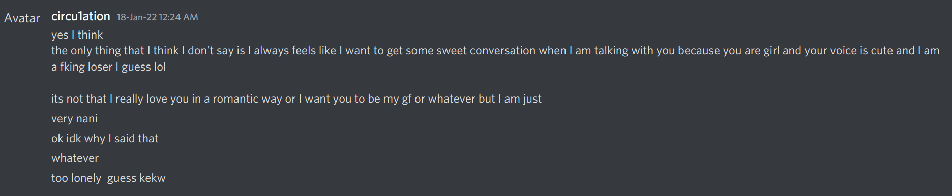 This is partly why I constantly ask 404 if I make them feel uncomfortable or if I made them upset. This is an unfortunate event that I wish I could go back and fix, but it was not something that ever had malicious intent or a manipulative tone. When I told 404 that I loved them, it was because they were being a basic human being towards me. they were someone that in contrast to everyone else in my life, was fun to chat with.