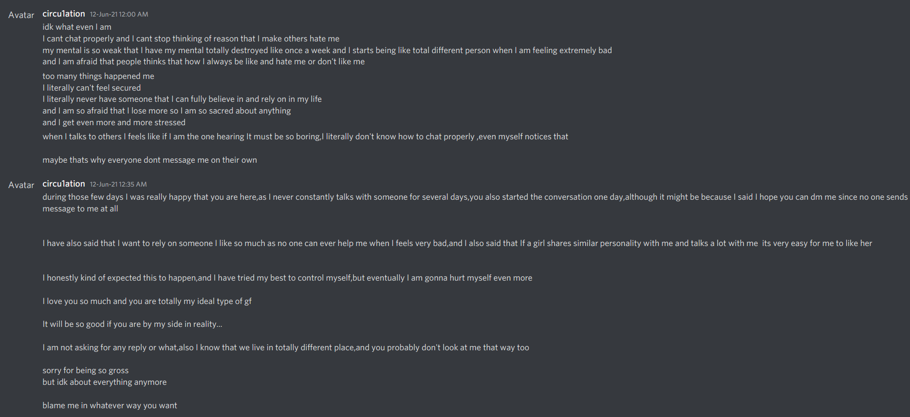 Excuse me if I sound like an incel. During this particular time, 404 was the only female non-family related person that I had consistent conversations with, which led me to believe there was some mutual interest and which spurred romantic feelings, albeit temporary. I should have clearly expressed these feelings at an appropriate time and not have conjoined it with my mental breakdown because this makes it look like I'm threatening my life to keep 404 as my friend. Though it is easy seeing this to say that I am an emotional manipulator, this is not the case. I simply have very terrible social skills and timing. When I'm in this state I say things without thinking while also having little awareness as to how the other person might interpret things. What is venting for me is seen as a suicidal threat to someone else. I am sorry.
