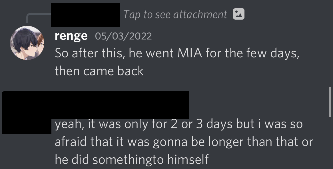 The reason why I felt like this was not a big deal in the grand scheme of things is because in the aftermath, me and 404 had normal conversations. If 404 felt forced or compelled to keep talking to me, I would assume there would be more distance in our topics of conversation. This is not what happened though, as 404 shared with me that they were going through their own suicidal ideation. As for the conclusion of this, I replied to 404 a few hours later assuring them that I was fine.