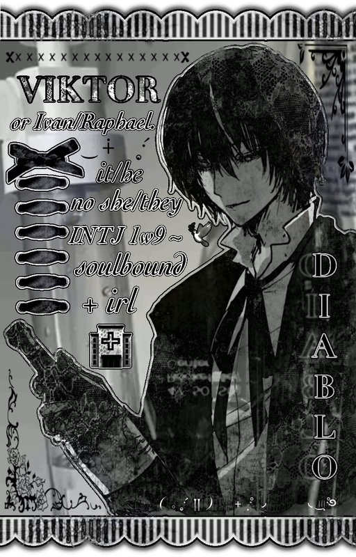 Hello. You can call me Ivan, Viktor, Akira, Salt, Raphael, or anything here. I use primarily It/He pronouns as well as xenos, never she/they. My gender identity is unlabled, though I lean towards the masculine side or the label agender. I am bisexual and polyamorous. I am soultied with a few people, primarily Diablo, Oda, Hades, and Wei Ying. My typology is INTJ · LII · 1w9 (SP/SO) · 1-5-9 · phleg-mel · Neutral Good. I am an IRL of 01, 02, 03, 04, 05, 06, 07, and more. There are a few factors that affect how I interact with others, including but not limited to dissociation, anxiety, memory loss, and sensory issues. I am diagnosed with UDD, PTSD, GAD, MDD, and a few other conditions. this may result in me going offline unexpectedly or being less communicative at times. If this happens, it is not personal by any means. For more information, you can visit my extended or directory. My only DNI is doubles of my s/os and ids, dottore selfshippers, and any doubles of my best friends lovers.