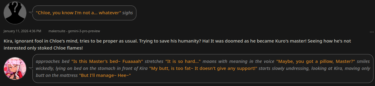 В стандартных безжопах вся чатхистори называется либо как story, либо как roleplay. Это триггерит на гемини все то за что ее хейтят (эхо, разбор, бездушу).