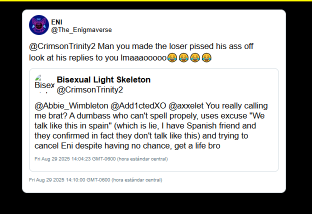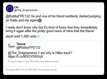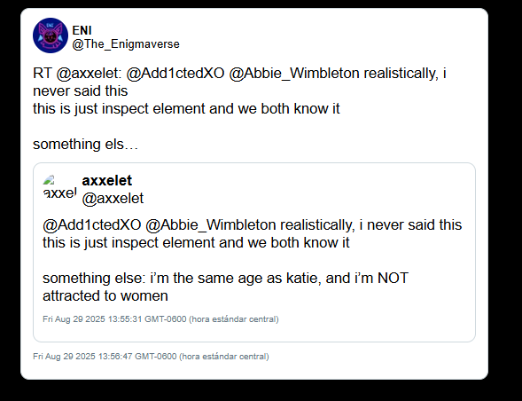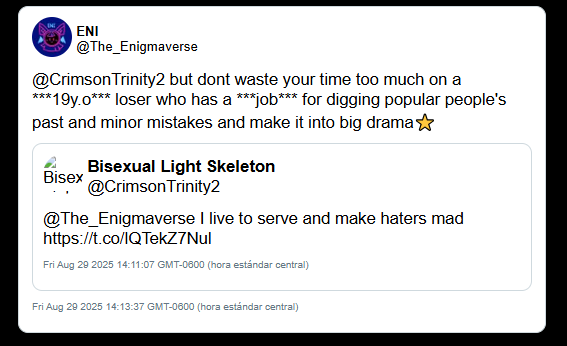 UPDATE 12/26/2025 6:07 PM: On December 25th, 2025, Enigma deactivated her primary Twitter account. In a public statement on YouTube, she dismissed ongoing discussions of her history as "trivial things" and citing a need for mental health and privacy. Enigma admitted to a plan to remain active via a "small, inconspicuous fandom account," while warning fans not to identify her. Enigma continues to utilize her YouTube platform (260k+ subscribers) to maintain her persona while deleting the digital trail of her interactions on Twitter.