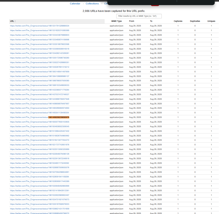 Now, if you go to Web Archive, place https://twitter.com/The_Enigmaverse on the search, go to URLs, go to tweets made in August 29, pop up the search in page (Ctrl + F) and place this number: 1961499256239656979.