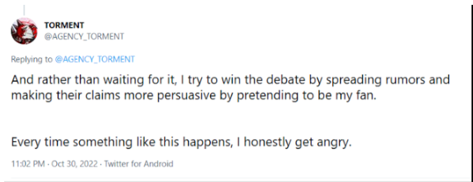 "I try to win the debate by spreading rumors and making their claims more persuasive by pretending to be my fan."
