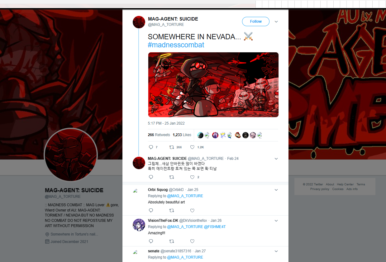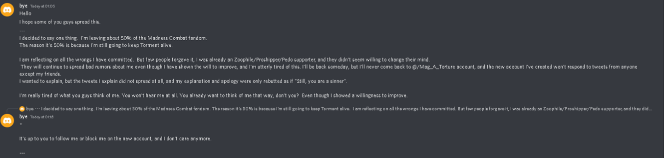 2021-2022 (Madness Combat Fandom): Known as MAG-S and MAG-A-TORTURE. Operated the Reddit account u/NONEIMAGINE.