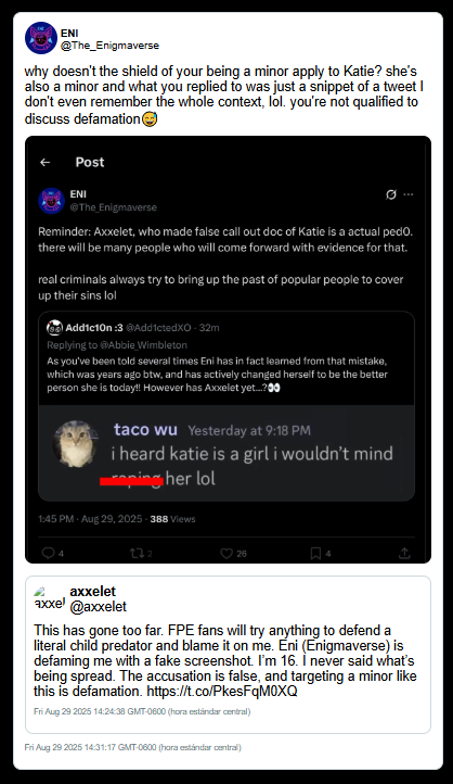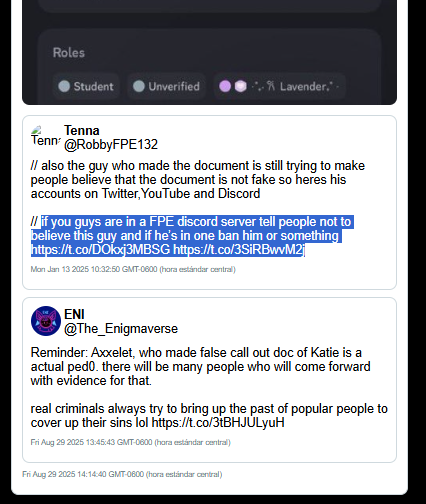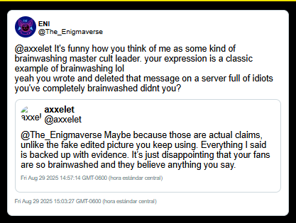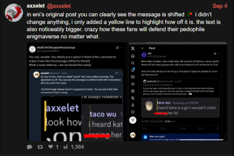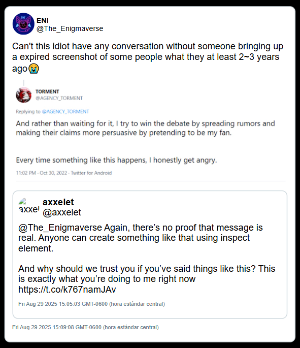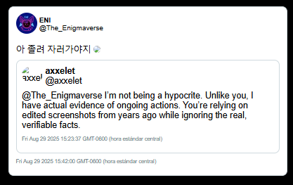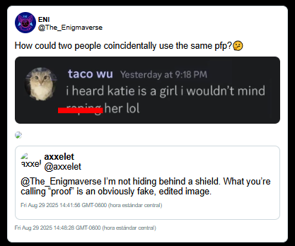 The Axxelet Incident: This evidence suggest Enigmaverse utilized potentially faked Discord screenshots to label a 16-year-old minor (Axxelet) as a "predator" to discredit their criticism. Visual analysis of these screenshots showed technical glitches (text alignment and font weight) consistent with manual editing.