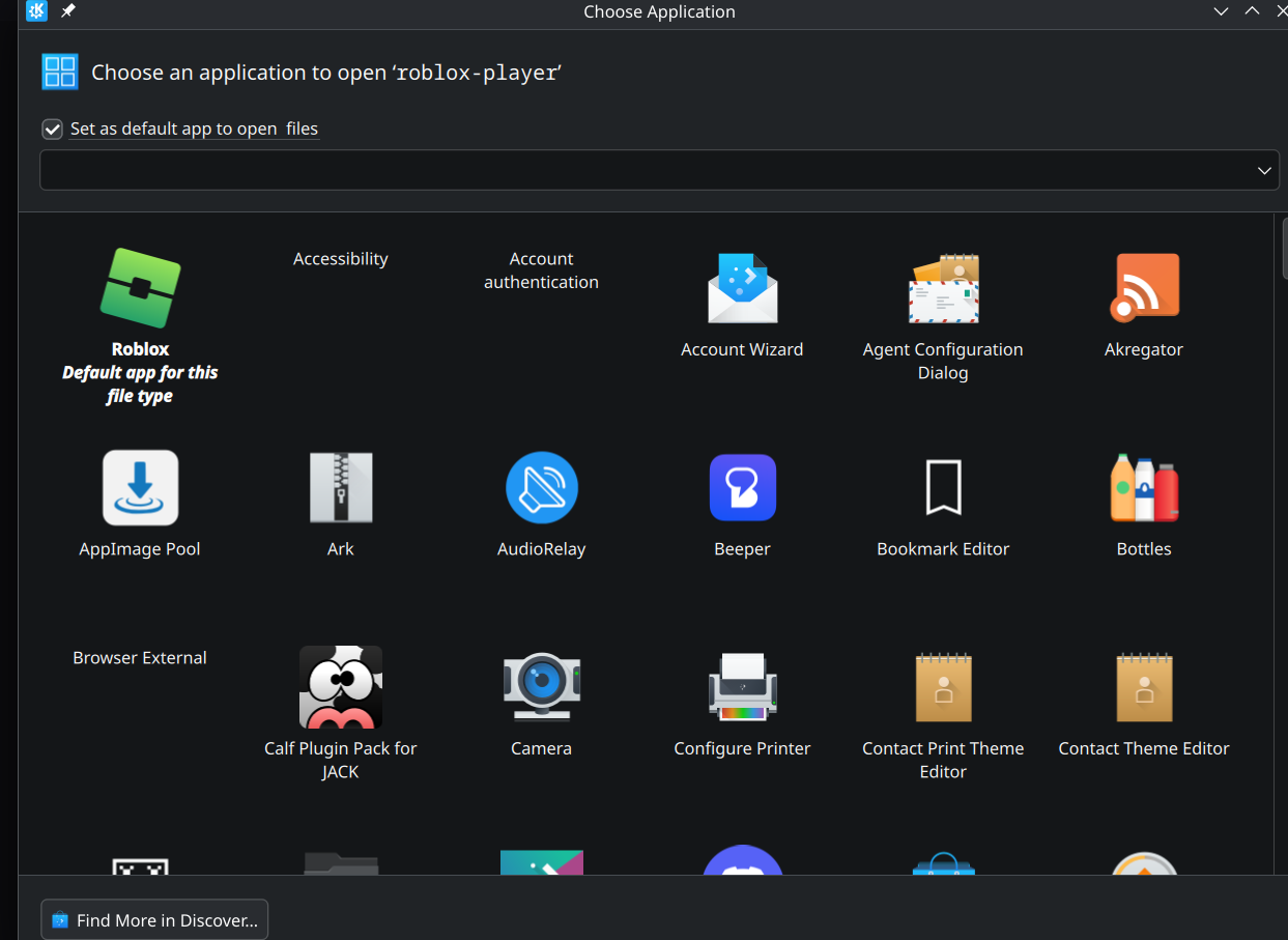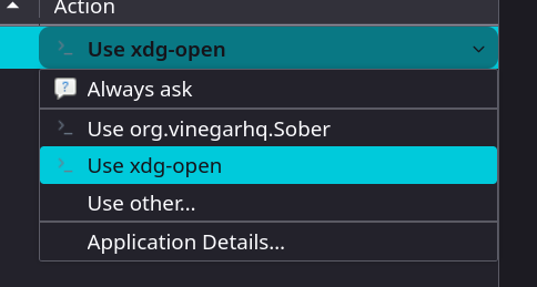 - Select Sober (titled "Roblox" in my screenshot, due to my custom shortcut name), and toggle "Set as default app to open files".