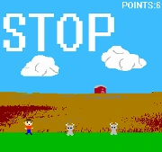 Anyway, Goat Jump is an apparently unlicensed NES game. Pop it into your NES and it starts right up. There are no credits, no start screen, and no explanation. The graphics consist of a scrolling ranch/prairie with the player being a really shittily-rendered, small cowboy. The ‘goats’ don’t really look like goats, but I guess they don’t look like anything else, either. A makes you jump, while B doesn’t do anything. Pressing start will pause the game, where the screen is mostly filled with the word ‘STOP’ in white block letters; pressing select will make your character stop moving and a loud buzzing sound will play. The music is low-quality psuedo-western beeps. Walking into a goat causes the same buzz to emit as if you’d pressed select, and the screen switches to black with the word ‘LOSE’ filling the screen. The game has to be manually reset from there.