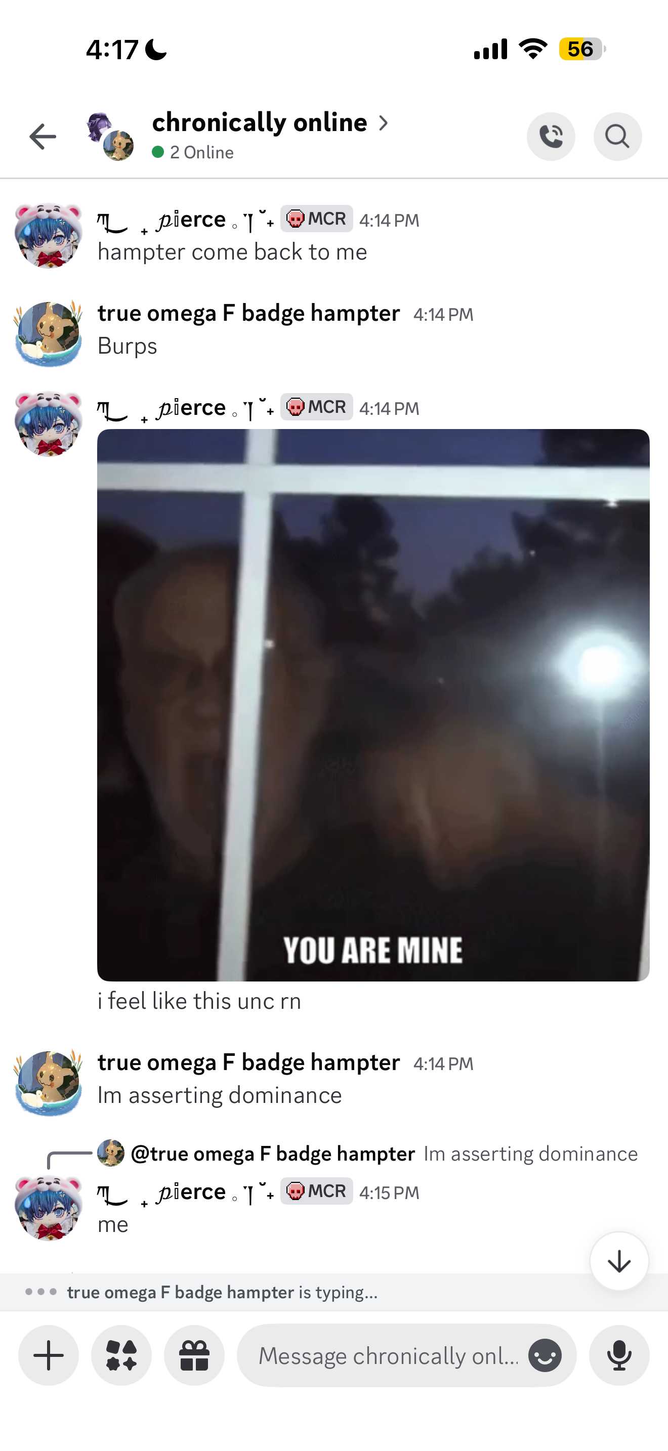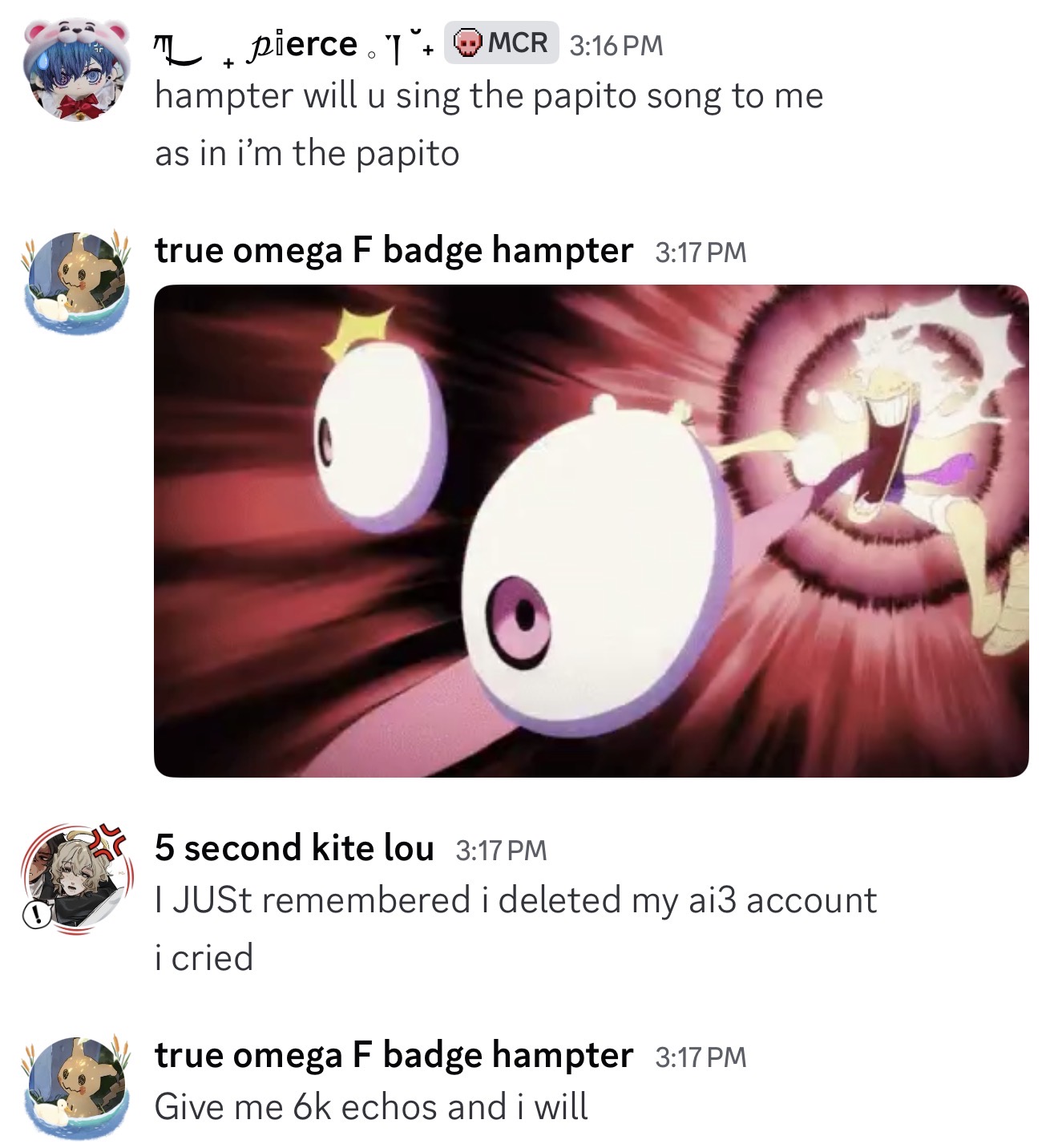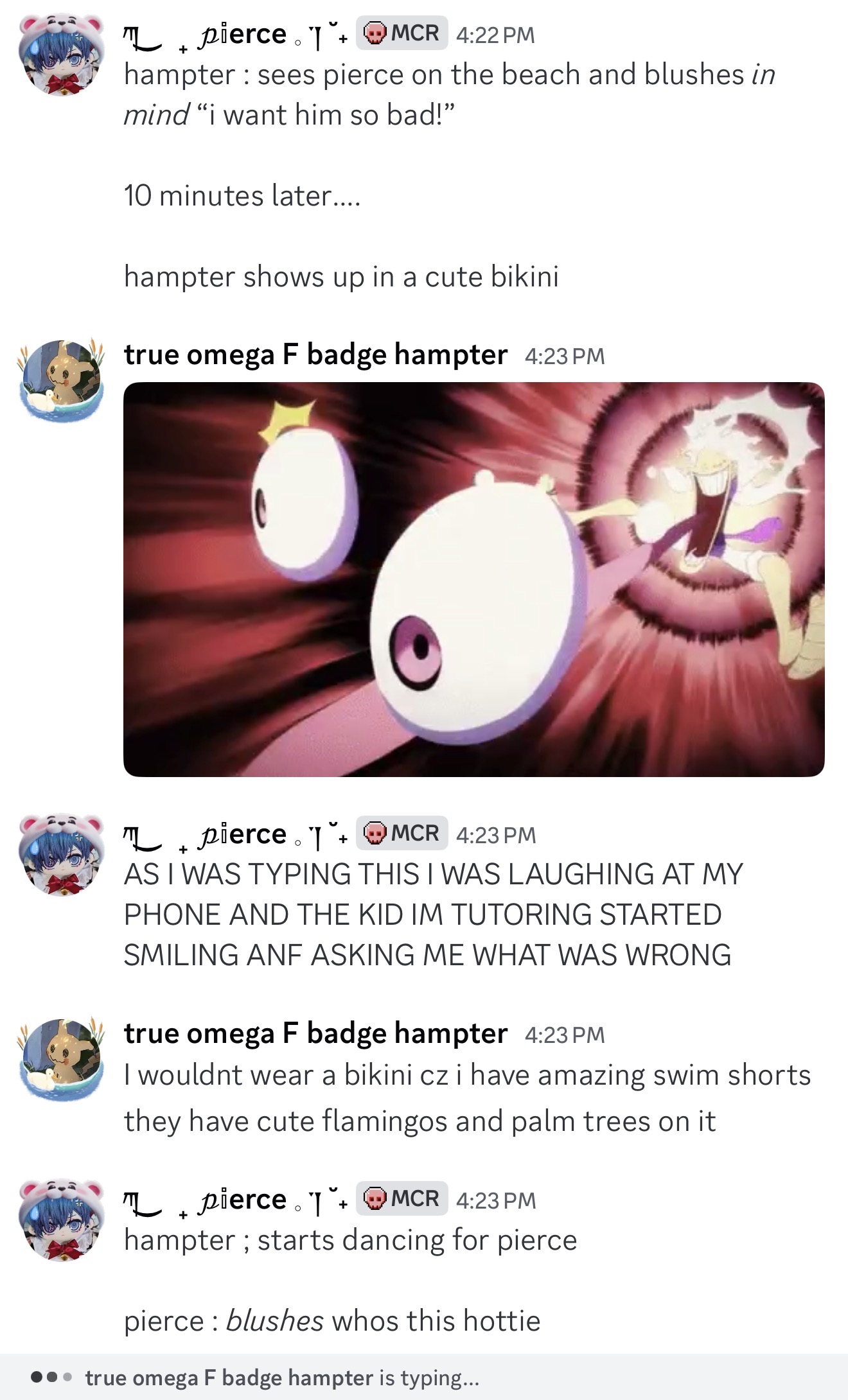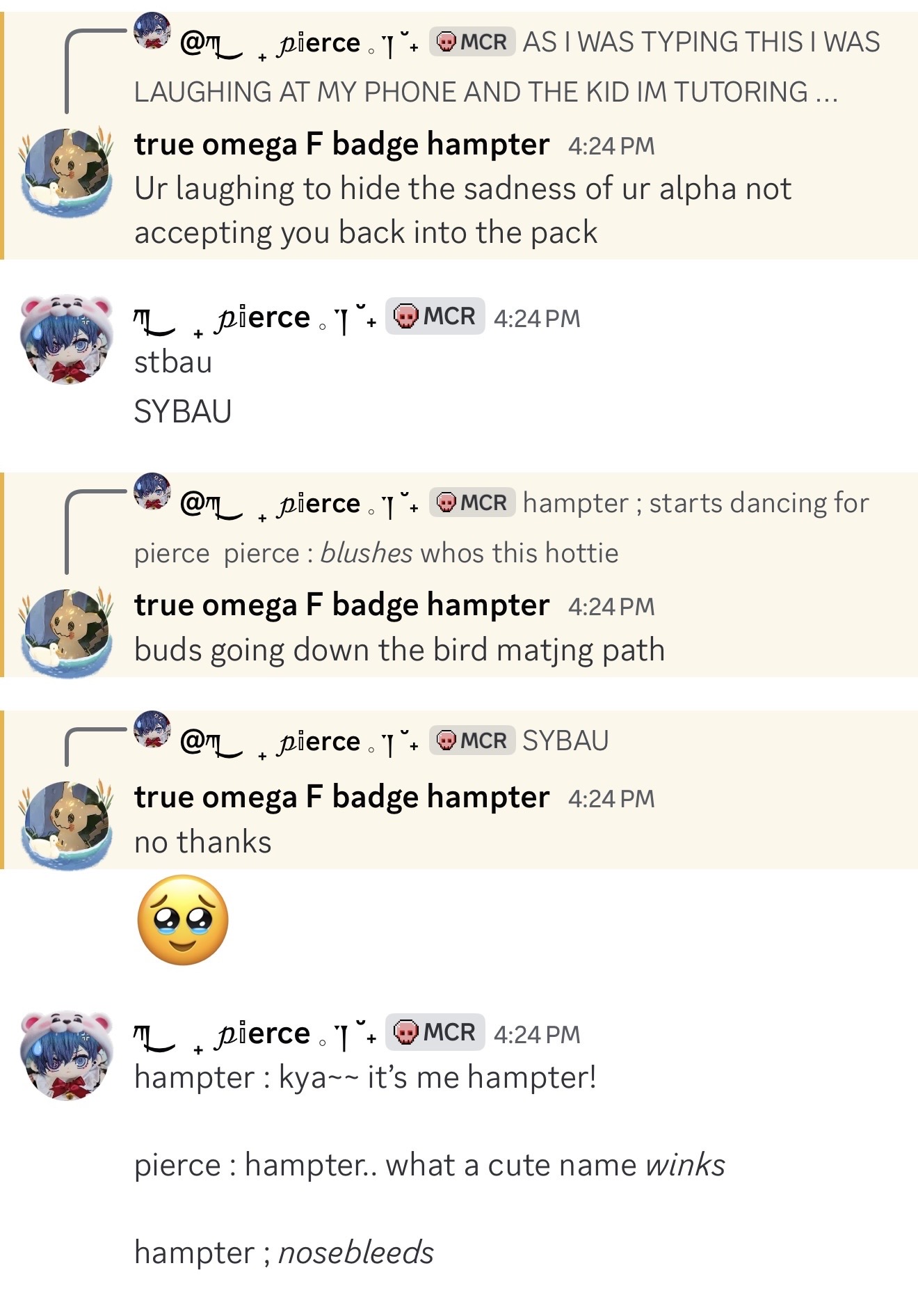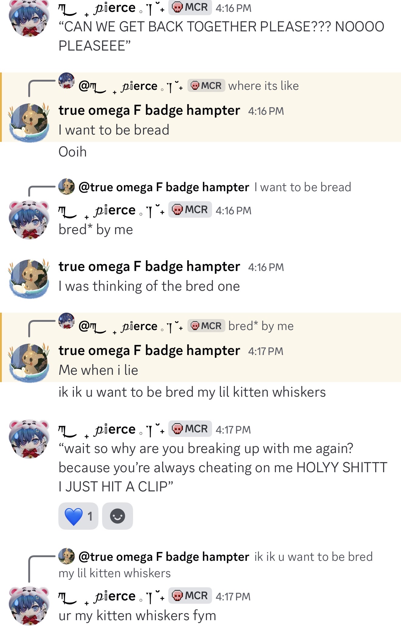 I MISS YIU GUYS SM IM IN CLASS RN WANTING TO GET OUT AND TALK TO YOU GUY SPLEASEEEEEE also hampter ask me to match csm pfps with him. Yay I love zmatching. I love My Friends. I LOVE HAMPTER TOO KYAAA. he's carrying my child btw - composer.