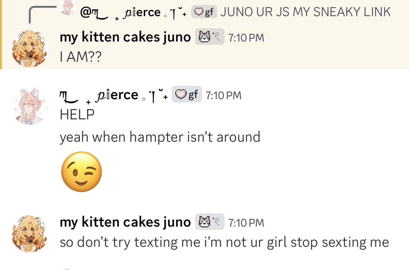 i really haven't laughed this much in so long with a group of friends, not after what happened in the last group chat. i've been blaming myself because i made one mistake and it caused the whole gc to fall apart because that person never accepted my apology, but i'm so glad i found you guys, it's been really rough for me to find friends and connection or just comfort in anything these last few months. i'm so happy there's people out there who get me and my humor, although i've never really open up to you guys about my person struggles, i'm so grateful for how you all still accept me for who i am, even those who aren't active - luka and ryo. i wouldn't have created such an awesome group without meeting juno first. i'm insanely lucky to know hampter and kei as well, you two are so funny and i always laugh so hard everytime we vc. i want nothing but safe and love for you guys, please stay away from my friends, i really need them to carry me this time. i want to become a better person this time and not ruin things, and more than anything, i want this to last. i want to come back from school everyday and see messages from my amazing friends. i love you guys more than anything. ♡