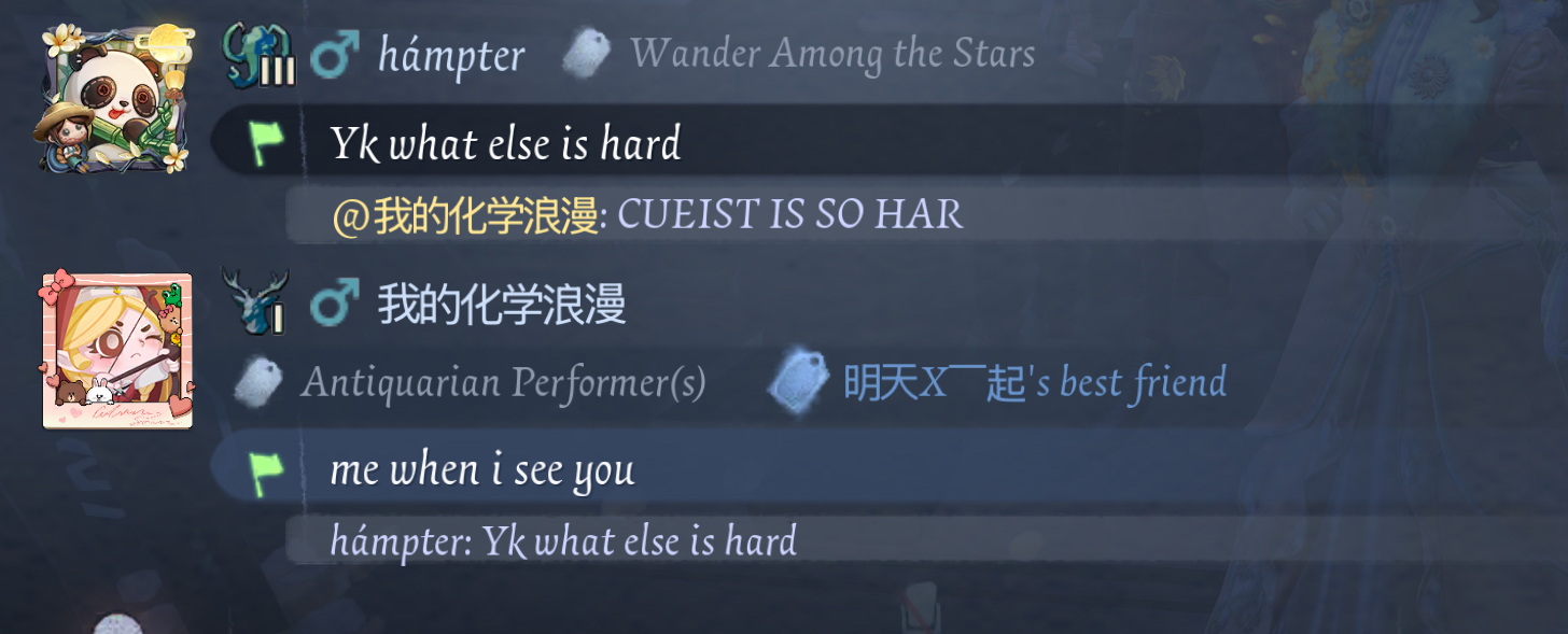 Hi vuys i just wanna say it was so much fun playing idv with you guys on Tuesday when we all vced and played QM and more modes and I SWEAR coa is calling for us. esp when kei got ts after excitement geisha WHICHWAS LITERALLY SO FUNNY bc that geisha started hitting the pallet i wasn't eveb at and we had a whole lotta yap when kei was introducing themself and listing things that they like while i was chasinf them in game and saying fatbalmer. Aesop with a BBL??? anyways the opera singer was evil for bleeding u all out except me i guess alice is special bats my eyelashes and then hampter joined us and we played hide and seek and BRO WAS A MOVING CHAIR AND RUNNING AROUNG THE MAP IT WAS SO FUNNY BC SOMEHOW HE DIDNT EVEN GET FOUND. we're not eveb F badges we're Z badges. anyways let's alll play roblox tg on the weekend. I MISS YOU GUYS SSO MUCH esp juno and hampter and luka