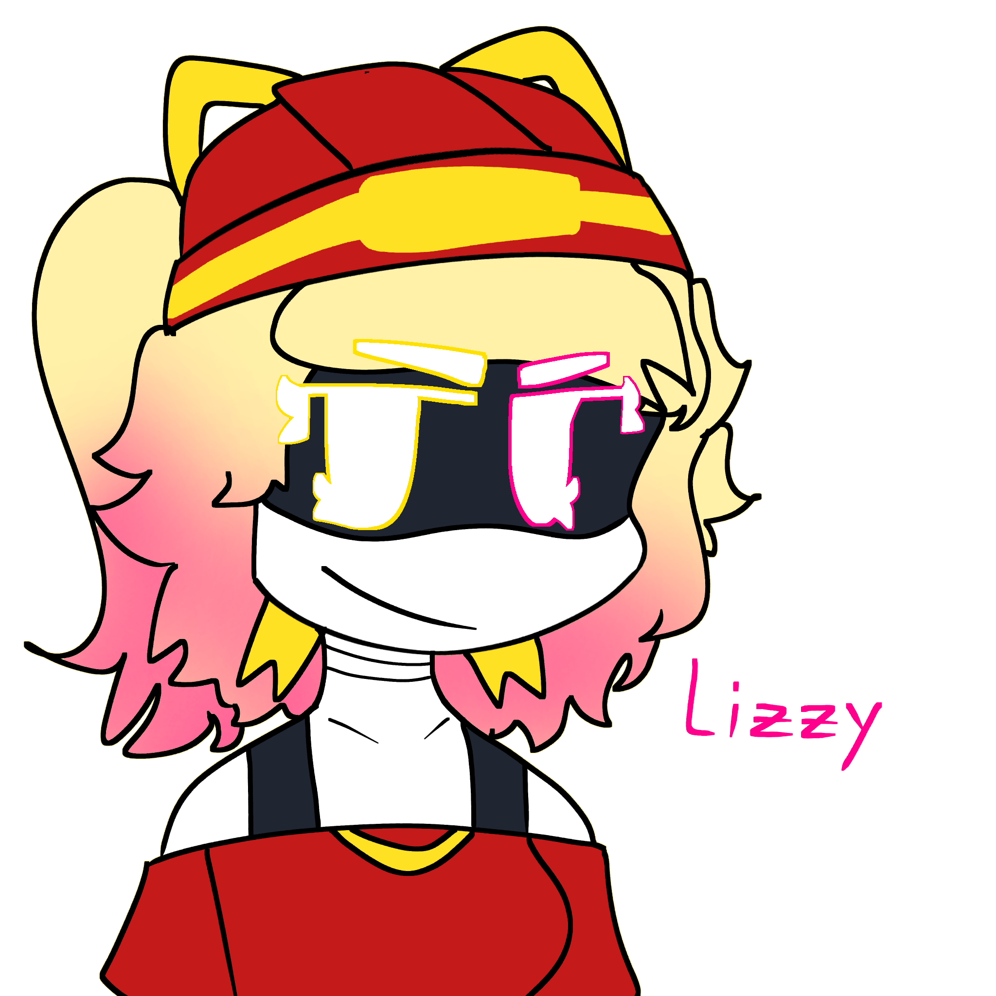 (cheerleader uniform, yellow bow, half pink hair, pink leg and arm warmers, black winter boots !)