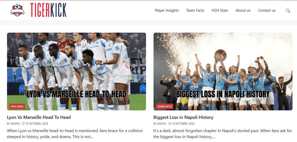TigerKick covers football news, transfers, tournaments, and statistics. It highlights historic matches, club traditions, and player records while explaining football terms, tactics, and tutorials on dribbling, passing, and technical skills.