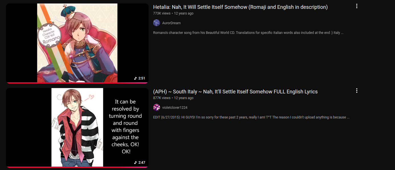This character song will be remembered for centuries i lvoe you so much i love you i LVOE you romano