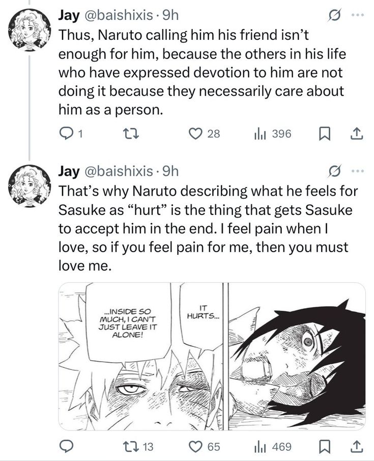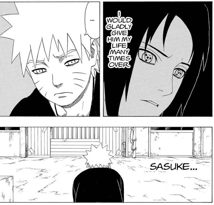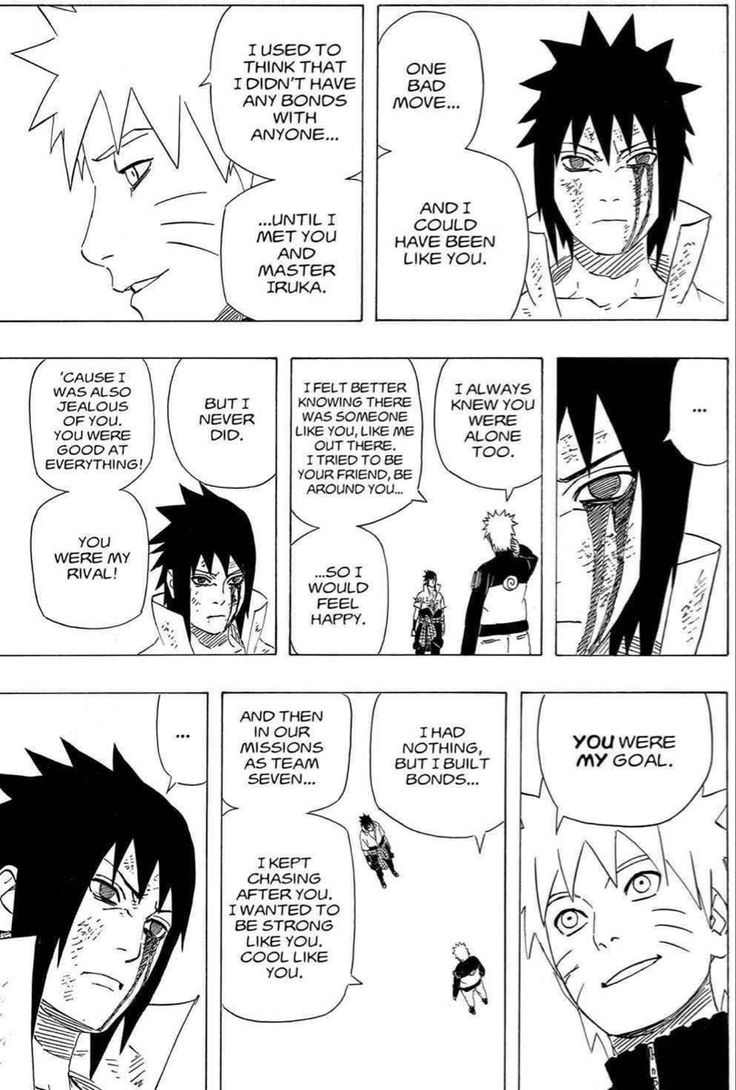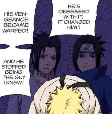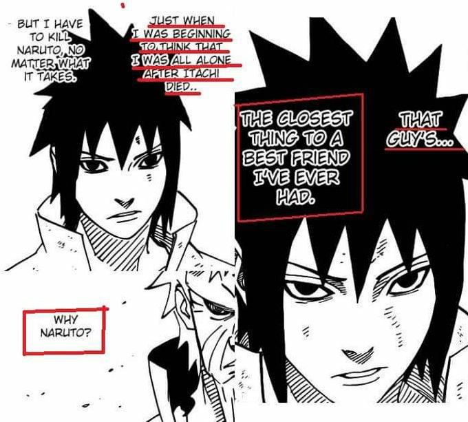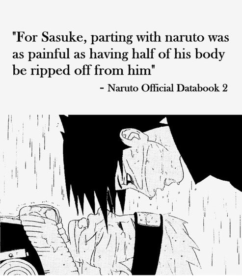ok first of all their relationship at its core is that theyre rivals. they constantly test each other in ways that gets each other riled up. theyre competition to each other, yet theyre also equals (to the viewer and also naruto and sasuke to each other, at least thats what sasuke thinks before shippuden) theyre both lonely kids who experienced loss of family. however, the difference between them both is that sasuke actively went through the loss while naruto already learned to coexist with it (because he already grew up with noone by his side, the villagers also shunning him out) Naruto grew up with the nine tails, Sasuke is an Uchiha— a clan viewed as potential traitors due to the sharingan after the nine tails attack. after the clan massacre, sasuke was just like naruto. alone. isolated..! i think this is also another reason why sasuke was pissed when sakura talked smack about naruto being an orphan, sasuke could imagine being in Naruto's shoes as an orphan... the reason they both contrast each other so well is that theyre literally two sides of the same coin. theyre so similar yet their goals are so different. sasuke thinks only power can truly fill the hole in his heart, going for revenge while naruto believes that strength is on the emotional (?) side. he never gives up, and this being evident in his goal of being a hokage. additionally, in an interview with the author, kishimoto, he said that everytime he progresses through the story with Naruto, he has to think about what sasuke will do next. why are they so obsessed with each other? why does Naruto keep chasing sasuke? sasuke didnt want to believe there were other paths that are possible. during the rooftop battle with each other in og naruto, they were both seen impulsively agreeing to spar each other (which was what would be their last time together, at least in the canon episodes) — this scene is very important and clearly expresses the obvious difference in them. naruto has always wanted to spar with sasuke to validate himself. he wants to make prove it to sasuke that they could be equals, or they are. but for sasuke this was an exam, a chance to see if he has truly gone stronger. after this, sasuke left konoha in search of stronger power — "this village will only drag me down". he saw how Naruto was improving, and he felt like he wasnt doing enough. this was a personal matter for sasuke, but naruto took this as an attack to what they have built over the ninja academy (?), like their friendship was nothing. he felt betrayed (especially since sasuke was the one who initiated the friendship initially — but people sometimes argue about this). an important thing is that, they are trying to prove themselves to each other. naruto wanted connection. sasuke wanted control. they fought, but Naruto never fought to win. he felt abandonment, and never wanted to feel it again (this is also why hes so keen on conecting with other people) "I won't let you go" (valley of the end) roughly translates to "I won't let anyone abandon me". After the final battle in shippuden, sasuke finally admits "defeat", or rather surrenders. sasuke stops running away (but tbh hes still doing that in boruto, ill get into that later). they just coexist with each other, an arm lost for both of them as a constant reminder of what they have been through, and what it took. "It's just, when i see you carrying around that burden and go on about everything the way you do... it just hurt." naruto said this to sasuke side to side laying on the ground. this line expresses so much raw expression of what naruto thinks about sasuke... naruto doesnt think sasuke is wrong or anything, he truly just felt hurt seeing his friend hurting. sasuke reacts surprised, met with emotional grief rather than opposing force. naruto notices that sasuke always insists on carrying everything alone, and thats why it hurts even more for naruto. he knows why, he understands and feels it, and thats why hes always chasing around sasuke — he understands sasuke more than anyone, and wants to save him.