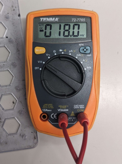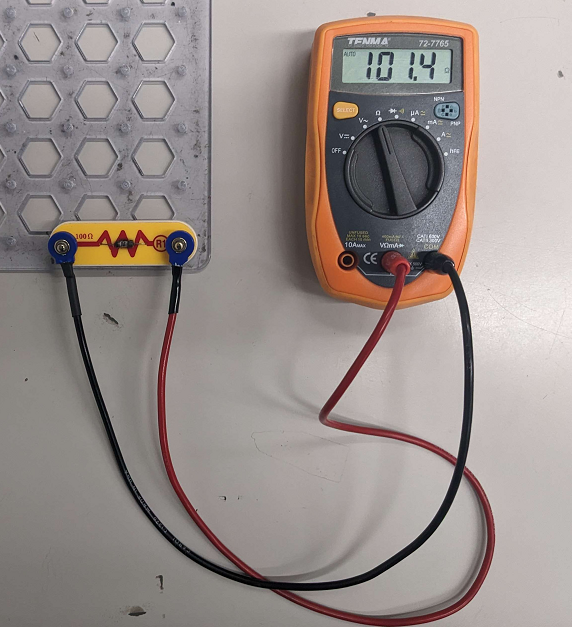 2. Take the element you want to measure (make sure it's disconnected from a circuit / no current is flowing through it). Connect the wires across and read the output: |