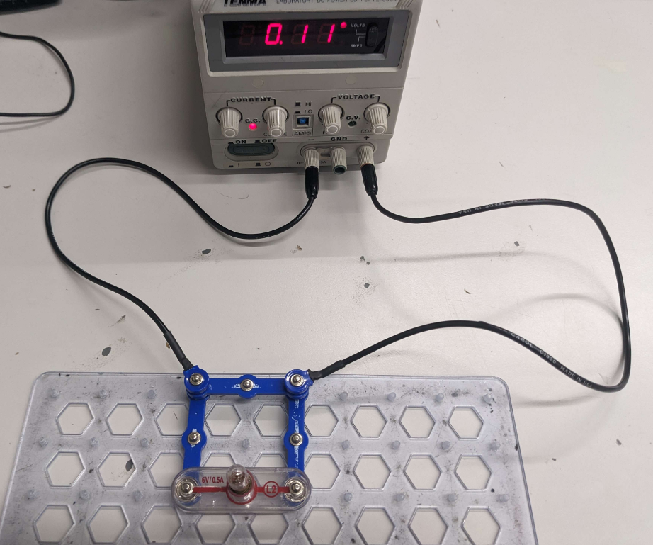 A short circuit occurs when electricity takes an unintended path with very low (or no) resistance, causing a large current to flow suddenly. This can generate excessive heat, damage components, or trigger safety devices like fuses or circuit breakers. Thankfully our power supplies can detect this and stop all current — when this happens, you will see a red light (labelled "C.C." between the current knob) and hear a slight "click" sound. Can you understand why the circuit below is shorting?