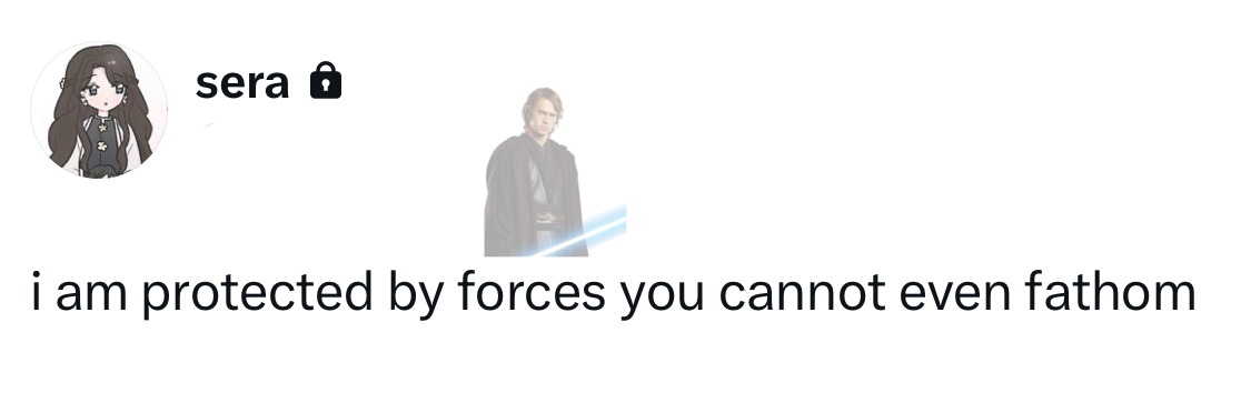 hello i am sera i am eighteen... privtwt exclusive because main began to scare me. most of my current tweets are about star wars, stranger things, true crime, and yumeshipping. i harbor a deep affection for anakin skywalker #loser you must believe me he is my favorite guy in the whole entire galaxy - i ❤︎ him more than anything!