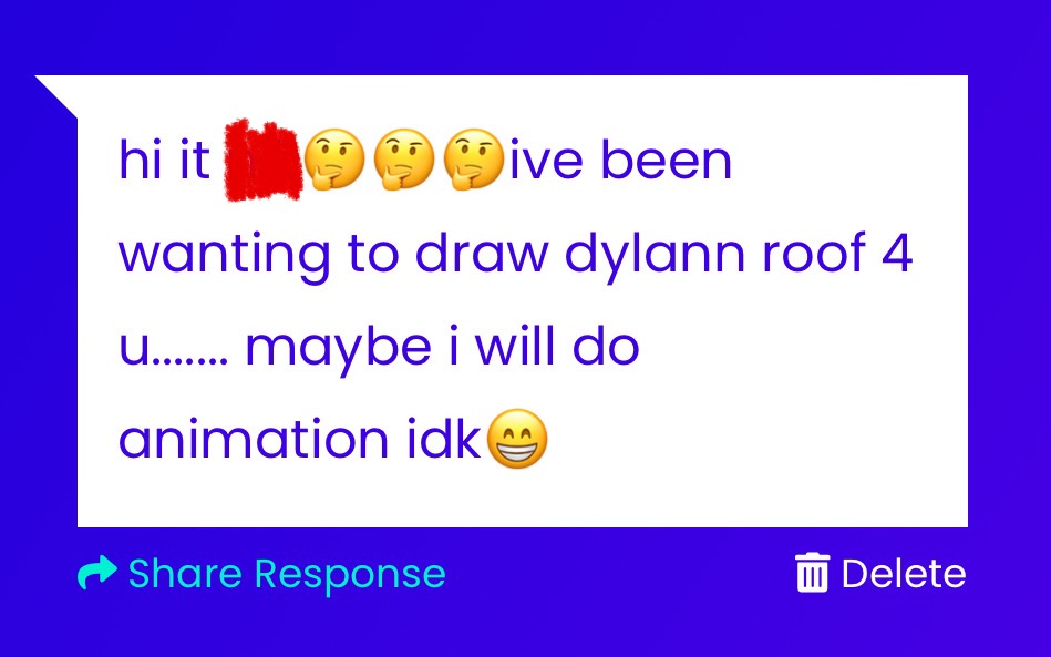 hello i censor ur name cuz u askwd me2 last timeπ(if i remebeer correctly) and i didnt know if u wanted me2do it again.. (plz lmk if u care or not in future thankz) dylann.. dylann plzzz.. PLZ. HE HAS NO GOOD ART OR ANIMATIONS THERES LIKE 4 ART OF HIM I LIKE AND UGH π€this wpuld be very peak.. i would not mind this.. thanku..