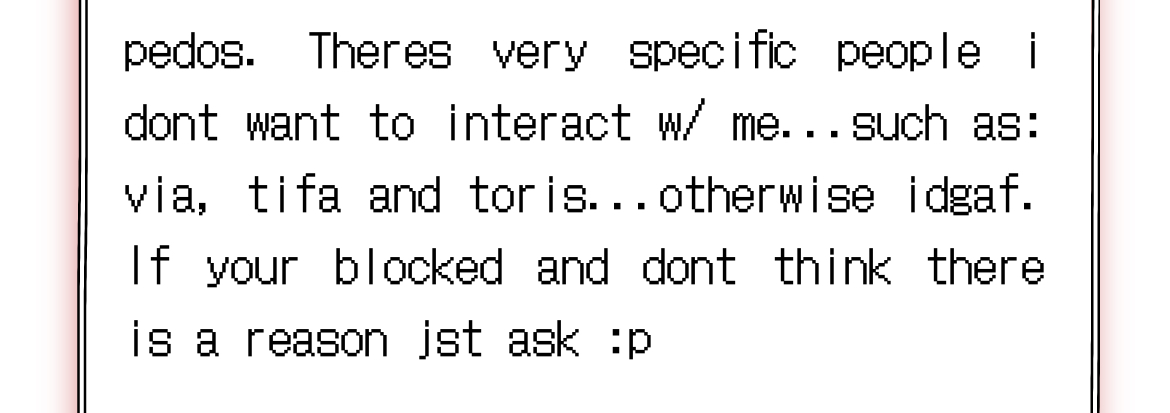 i have Petulant BPD and Autism and some other issues I do not feel comfortable listing. My typology is ENTP sx/sp 3w4 379 (so7w6 sp9w8) SLUEN Mel-Chol True Neutral and I am an Aries. My timezones are CST and EST (i frequently fly to see my boyfriend, so its depending.) I try my best to be kind so please return the favor.