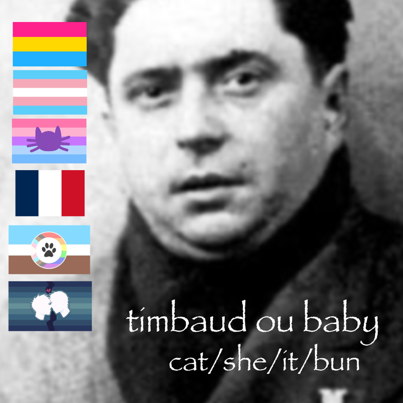 hewwo! mai name is timbaud, timmy, ou baby :3 i am a pansexual trans polyyume catgender and doomedyaoigender fuwwy! i use cat/she/it/bun/bottle/paw pronouns ~ i am a yume of tarthur terlaine fwom tungo tay togs! hewe is mai bsd oc: